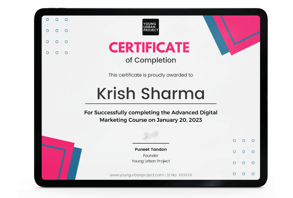 Young Urban Project’s Digital Marketing Course is a top certification program in India that provides practical upskilling and hands-on projects. This course will help working professionals, entrepreneurs, freelancers, and freshers upskill while they work or study. The teaching methodology in this course is interactive and is tailored to produce measurable outcomes.